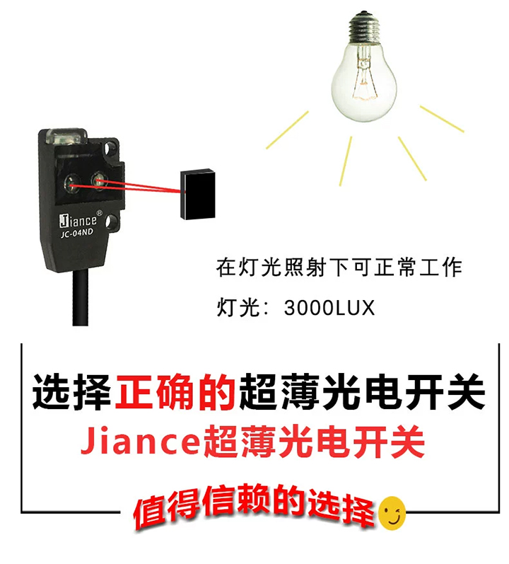 JC-04系列進(jìn)行抗干擾優(yōu)化,抗燈光干擾性能良好,抗日光10000Lux,燈光3000Lux,并且反應(yīng)快速度高,開(kāi)關(guān)頻率1KHz。