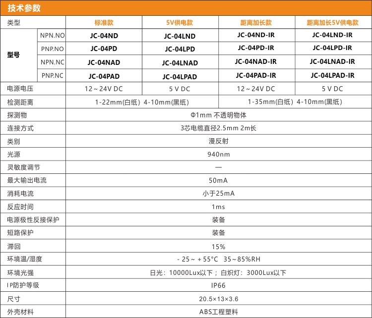 JC-04D系列 是漫反射的光電開關(guān),機身上帶發(fā)光孔和收光孔,發(fā)出可見紅光進行檢測。機身上有紅色電源指示燈和綠色輸出指示燈,指示燈明亮易觀察。同時帶兩個M2的螺絲孔用于固定安裝。