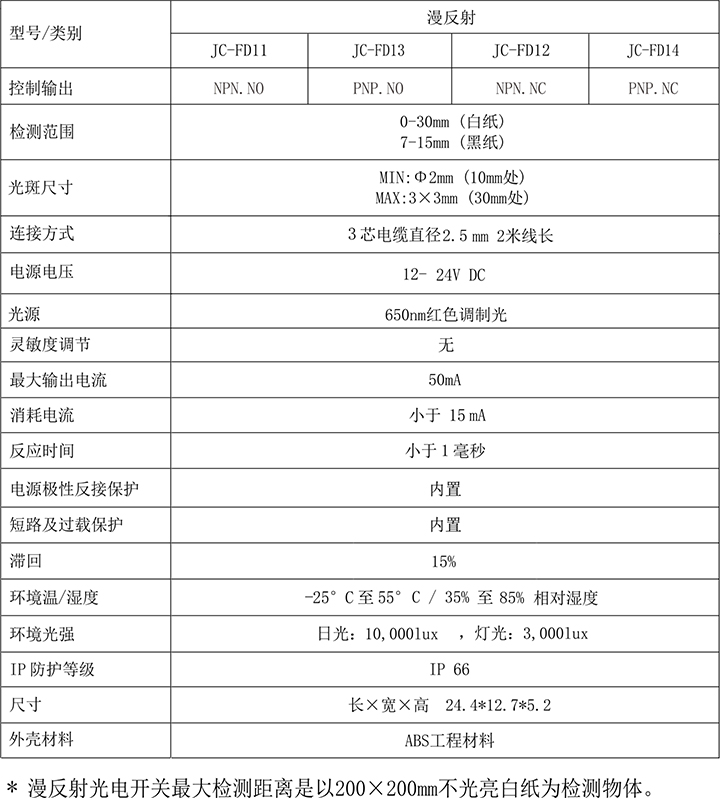 JC-FD系列超薄光電的光斑檢測距離在20mm處,光斑大小為2.5*2.5mm。光斑在檢測距離在10mm處,光斑大小為2mm。