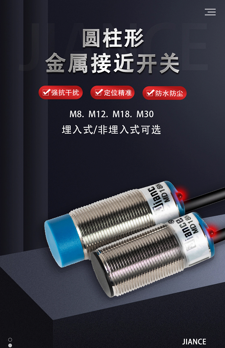 Jiance 電感式接近開關(guān)JY-P系列在工業(yè)自動化的應(yīng)用非常廣泛,如流水線金屬物體計數(shù)、機床限位、氣缸位置檢測等。 也有作為安全防護(hù)使用,檢測機械臂是否到位,還有在汽車行業(yè)的應(yīng)用,變速箱齒輪位置監(jiān)測。