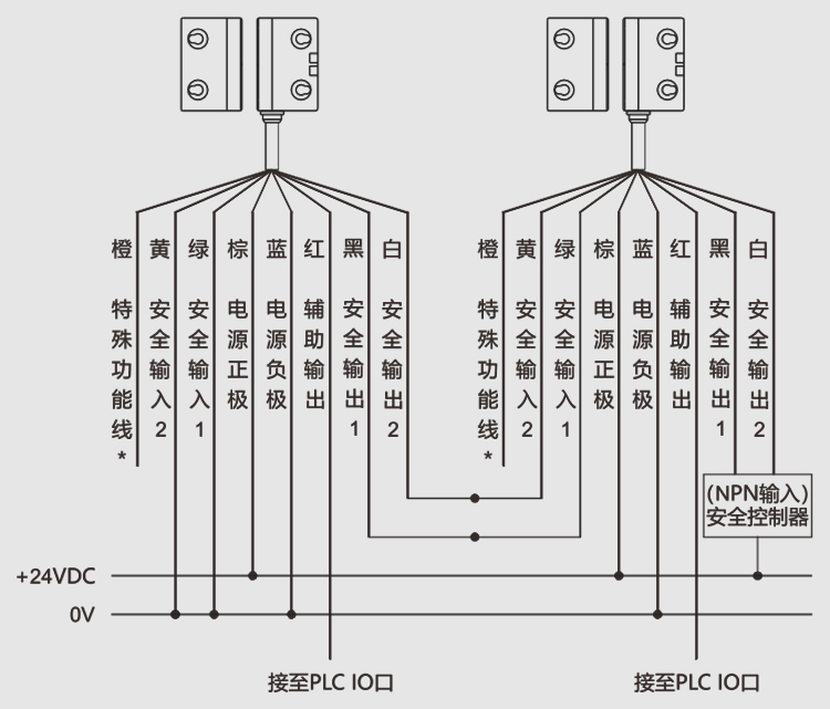 以NPN型產(chǎn)品為例,級(jí)聯(lián)款的接線需要接正極、負(fù)極、輸入線和輸出線,輸入線有兩條(黃色線、綠色線)輸出也有兩條線(黑色線、白色線),紅色線接PLC可以讓PLC知道是級(jí)聯(lián)中的哪臺(tái)傳感器觸發(fā)狀態(tài),其它線懸空。