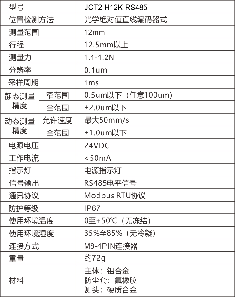 Jiance 接觸位移傳感器JCT2系列,通過光學絕對值直線編碼器原理,使傳感器具備高分辨率,不產生累積誤差,不產生失步。支持串口通訊,多種量程規(guī)格可選??蓽y量厚度、距離、直徑、偏移度、平整度等。 JCT2系列 兩款測量行程12mm/25mm,精度更高達 0.5um/1.0um,配備彈簧復位,高速返回數(shù)據(jù),支持動態(tài)測量工況。