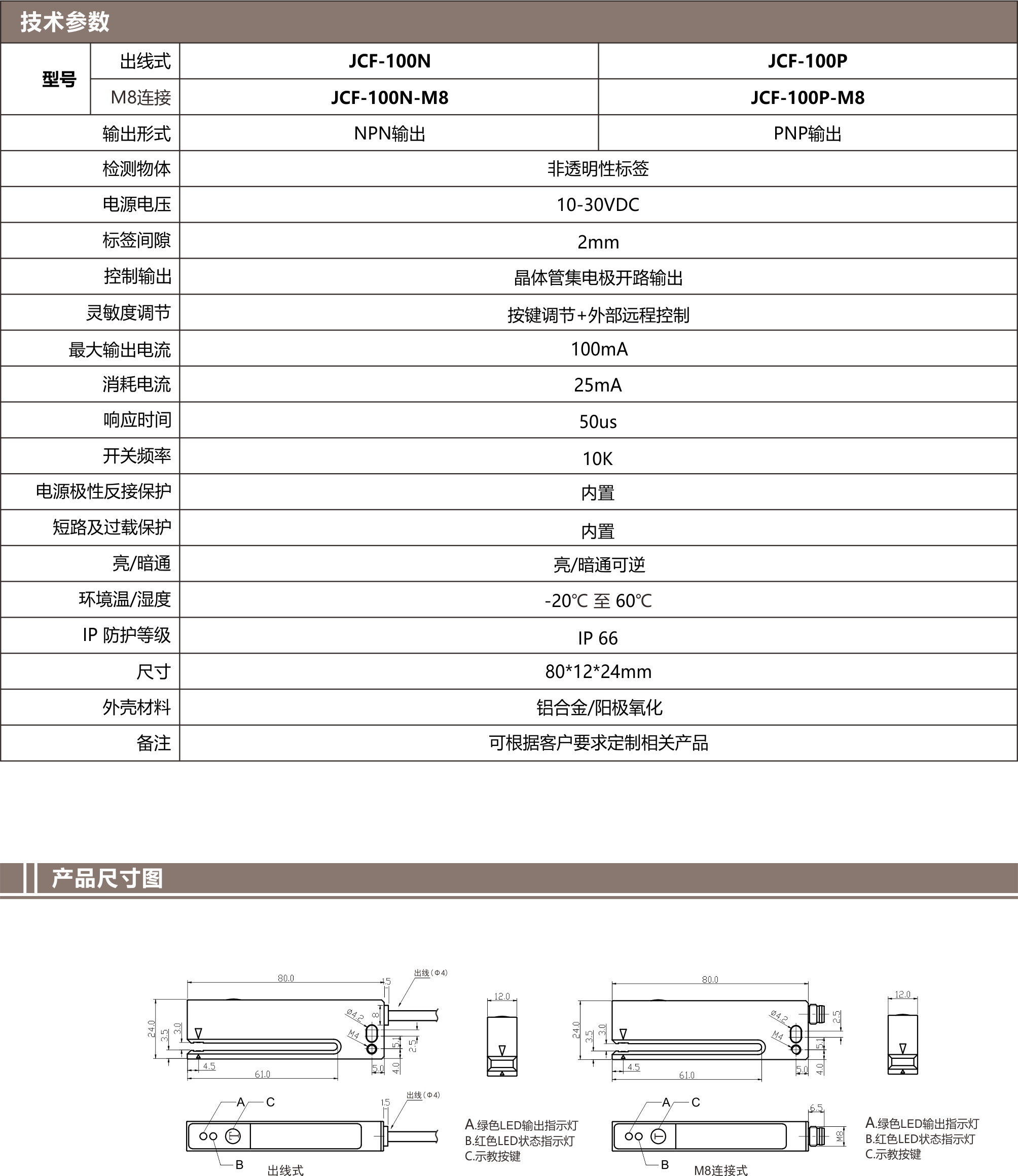 Jiance 光電標(biāo)簽傳感器 JCF-100系列 可以高速檢測標(biāo)簽達(dá)10Khz,常開常閉可切換,常開是檢測到標(biāo)簽輸出信號(hào),檢測到間隙停止信號(hào);常閉是檢測到間隙輸出信號(hào),長按設(shè)置鍵8秒切換。