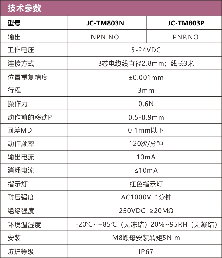 JC-TM803系列為探桿式接觸頭,帶動作輸出指示燈,位置重復精度可達0.001毫米,動作前移動PT為0.5~0.9mm,輕觸操作,只需要0.6N力即可操作,結構設計巧妙,防水等級達到IP67,在水或油飛濺的場景也可以放心使用。不銹鋼金屬外殼,減少腐蝕,使用更放心更長久。