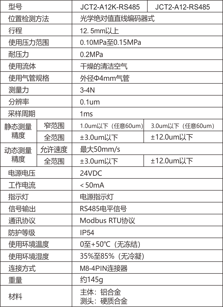 JCT2-A12K-RS485為氣動型,由氣管接口可接直徑4mm氣管,通0.12~0.17mpa氣壓推出探桿,測量精度可達3um。支持RS485 modbus rtu ,可高速返回數(shù)據(jù)每秒1000次,實現(xiàn)動態(tài)測量。
