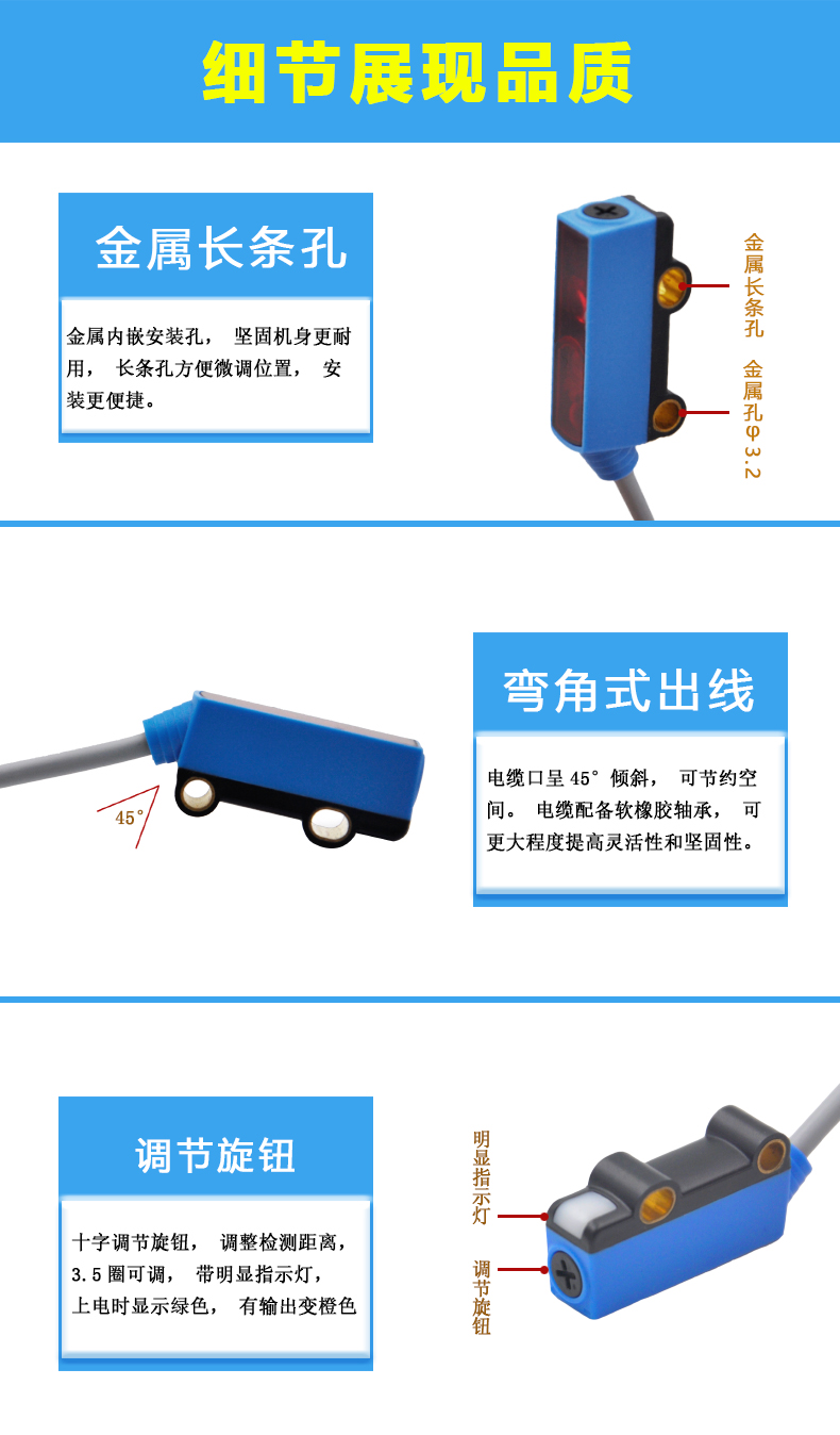 JIANCE 光電開關(guān)JC-1451系列是具有背景抑制功能的光電開關(guān)中尺寸最小的款式,它秉承光電開關(guān)的優(yōu)良特性檢測距離遠,檢測白色距離達到1~120毫米,檢測黑色距離5~110毫米,黑白差值小。產(chǎn)品機身厚度7.7毫米節(jié)省安裝空間,反應速度快,有效保證了應用中不會出現(xiàn)過多的反應延遲。上電時發(fā)出紅光,可清楚看到感應的位置,方便調(diào)整檢測范圍。