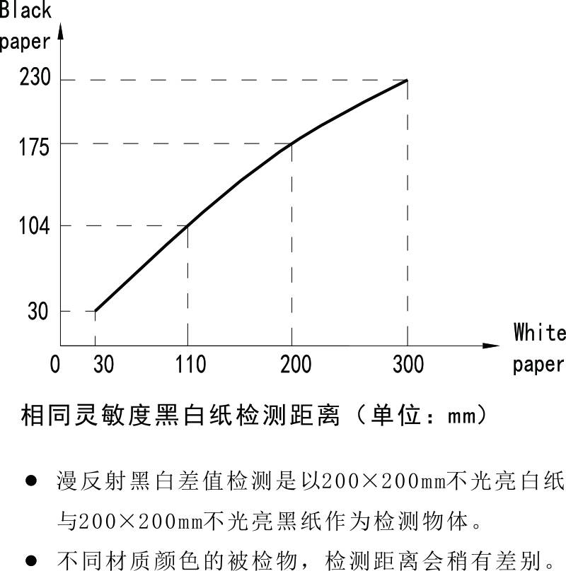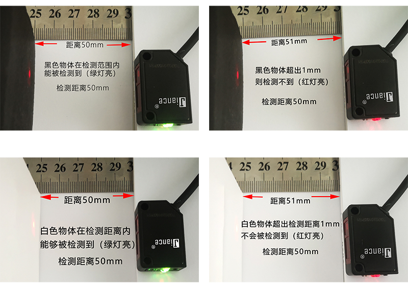 在距離較近處,剛好檢測(cè)白色物體時(shí),也能檢測(cè)到黑色物體;在較遠(yuǎn)處,剛好檢測(cè)的白色物體和黑色物體相差很小。